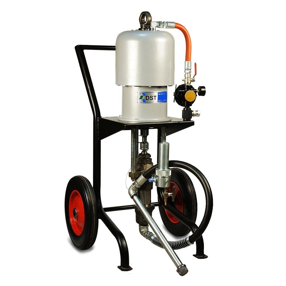 Поршневой окрасочный агрегат для безвоздушного распыления вязкой краски, работающий от сжатого воздуха из компрессора или от заводской пневматической сети. Окрасочный агрегат предназначен для промышленной покраски  на заводах по производству металлических конструкций, вагонных заводах, на производствах, где требуется массовая покраска однотипных изделий одной и той же краской, также аппарат применяется для антикоррозионной покраски, обработки металла цинконаполненными красками, покраски мостовых конструкций, также аппарат применяется для покраски многоэтажных домов, в условиях, когда требуются экстремально длинные шланги, также аппарат применяется для окраски кораблей в судостроении и судоремонте, когда нет возможности передвинуть окрасочный аппарат и приходится красить на достаточно большом удалении от аппарата. Окрасочный агрегат может красить круглосуточно, так как он охлаждается от краски. Агрегат может распылять безвоздушным способом краски на водной основе и краски на растворителях.  С красками средней вязкости он может работать на два-три малярных поста одновременно.