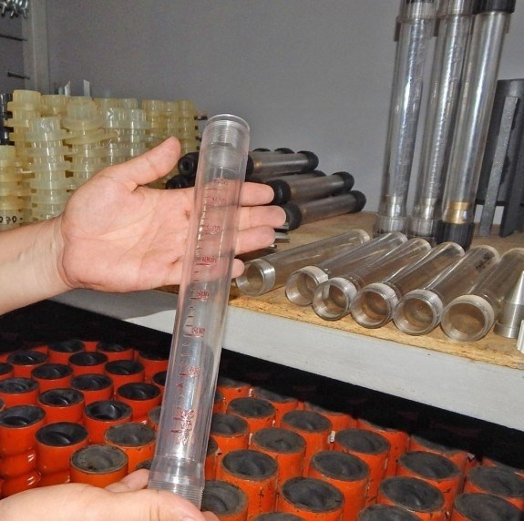 Колба расходомера выполнена из ударопрочного прозрачного стеклопластика, предусмотрена шкала, а также нанесение на внешней стороне колбы расходомера штукатурной станции рисок уровня воды.