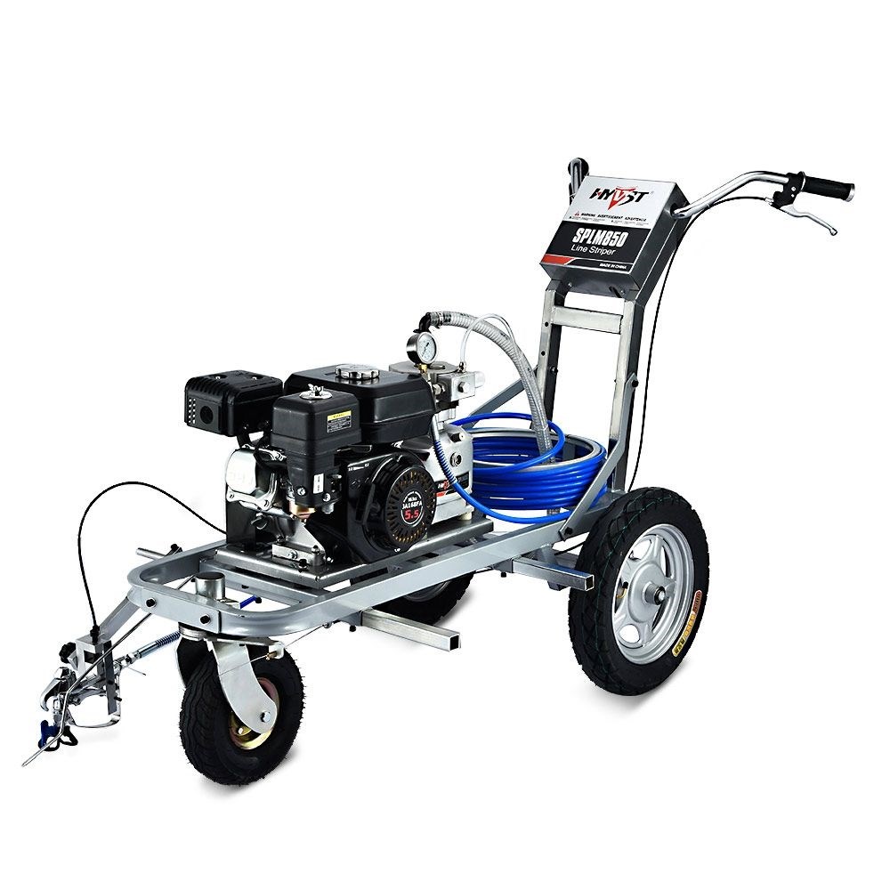 Машина для нанесения дорожной разметки краской. Разметочная машина с одним пистолетом предназначена для нанесения сплошных и прерывистых линий краской на дорогу, разметки пешеходных переходов, нанесения дорожных знаков и надписей на дорогу, разметки парковочных мест около магазинов и выставочных залов, разметки спортивных площадок и футбольных полей. Разметочную машину можно использовать только с краской, пригодной для безвоздушного распыления. Также машину можно использовать для разметки дорожных бордюров, мостовых конструкций, столбов фонарного освещения, можно также ее использовать как бензиновый окрасочный агрегат и красить фасады зданий и бетонные заборы.