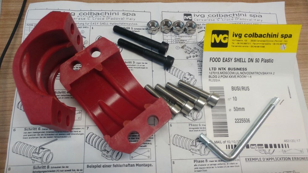 Специальная конструкция обойм EASYSHELL не только обеспечивает их надежное прилегание к поверхности специальных гофрированных рукавов IVG (Millennium, Vinoflex, Oilmill, Milkservice) и имеет подключение к фитингам (фланцам) стандартов типа Passo Enologico, DIN 11851, DIN 281, DIN 2826, что предоставляет широкие возможности применения и упрощает сервисное обслуживание. Система EASYSHELL предназначена для многих областей применения, в частности для пищевой промышленности в комплекте с рукавами линии FOOD VINOFLEX.