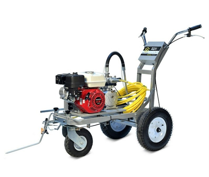 Машина для распыления дорожной разметки краской. Разметочная машина с одним краскопультом предназначена для нанесения сплошных и прерывистых линий краской на дорогу, разметки пешеходников, нанесения дорожных знаков и надписей на дорогу, разметки парковок мест около магазинов и выставочных залов, разметки спортивных площадок и футбольных полей. Разметочную машину можно использовать только с краской, пригодной для безвоздушного распыления. Также машину можно использовать для разметки дорожных бордюров, мостовых конструкций, столбов фонарного освещения, можно также ее использовать как бензиновый окрасочный агрегат и красить фасады зданий и бетонные заборы.